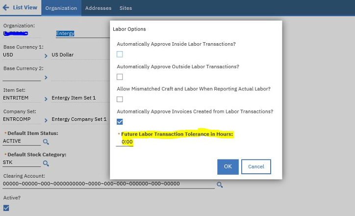 In the situation where only one Site wishes to allow Future Labor, the viable solution we have developed is to create a custom table based on the LABTRANS table and a new section on Labor Reporting to specifically handle the entry of future hours on an administrative “blanket” work order, and then have an autoscript that will apply these “future” hours to the normal LABTRANS table only after the date on the future hours has passed. This of course could be applied only to specific Sites, or even individual Laborers at a Site, if desired.  This provides a more flexible solution, but certainly does take more development effort than just setting that Organization Lab Option.