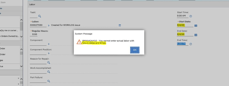 Occasionally we run into a situation where a client needs to claim hours in the future.  We see this request come up only infrequently, but there are surprisingly valid reasons as per a client’s business processes that it needs to be done.  Typically this is done with administrative “blanket”-type work orders (for things like administrative work, vacation time, safety meetings, etc.) and the requirement almost always comes from a client who uses Maximo for Full Labor Reporting, in which every team member needs to enter their full time hours in Maximo.  Out of the Box Maximo settings preclude this….